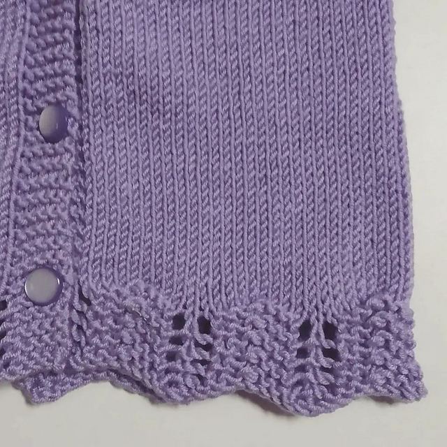 Tricotar a carreira seguinte da seguinte maneira pelo avesso: 7 malhas em ponto mousse, tricotar em liga até restarem 7 malhas, terminar com 7 malhas em ponto mousse. As 7 malhas de cada lado da peça são as malhas das orlas das frentes.